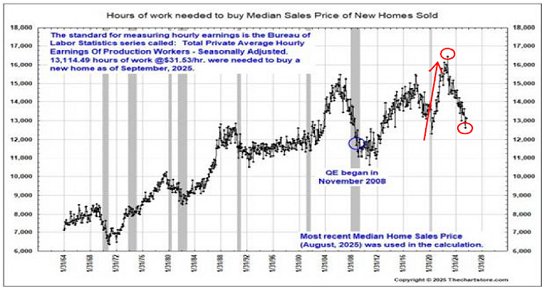 This walks us back to our previous edition, where we placed a valuation metric onto home prices (and the stock market) via how many hours of work it takes to purchase the median price of new homes sold relative to average hourly wages. Both measures offer deep history, which in turn offers excellent historical perspective for the valuation metric.