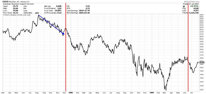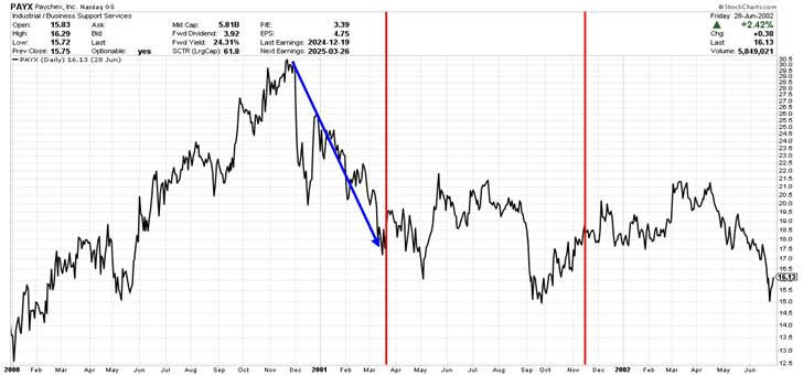 The above chart depicts Paychex shares beginning in the year 2000 and continuing through the first half of 2002. Our red vertical lines depict the beginning and then the end of the recession in that period.