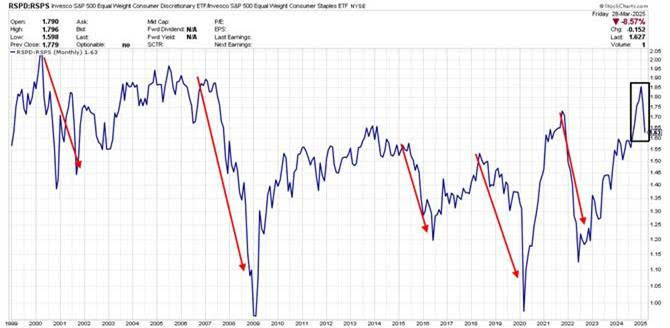 This takes us to our current day with our far right black rectangle. This is highlighting the notable drop in this ratio analysis in late 2024 to the early part of this year. This has pointed to increased cautiousness by collective participants as this year began and has continued to date.