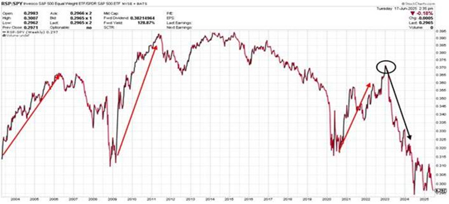 Rather than the equal-weight S&P 500 index kicking into overdrive with a continuing strong uptrend, it did a historical opposite and has essentially nosedived in comparative performance to that of the weighted version.