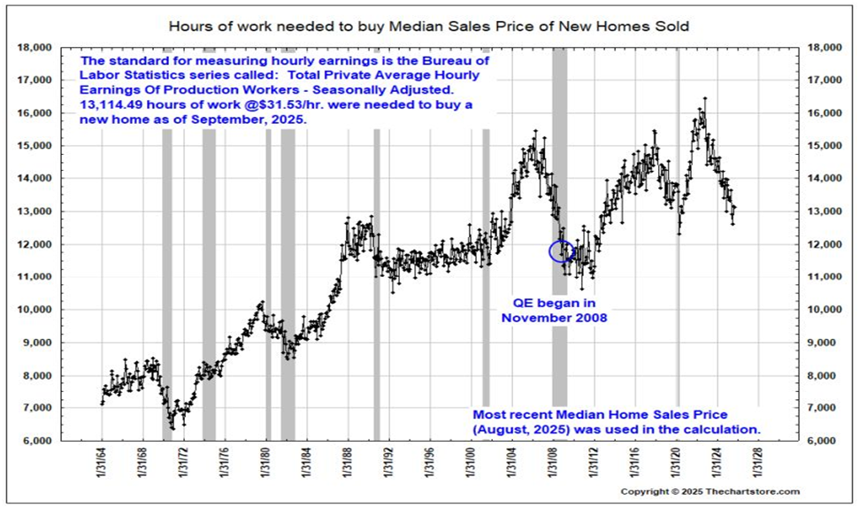 Back in the 1960s through the mid-1980s, it took around 8000–9000 hours of work to purchase the median price for a new home. Over ensuing decades this escalated to a high point of just over 16,000 hours. Our current reading measures in the low-13,000 hours area.