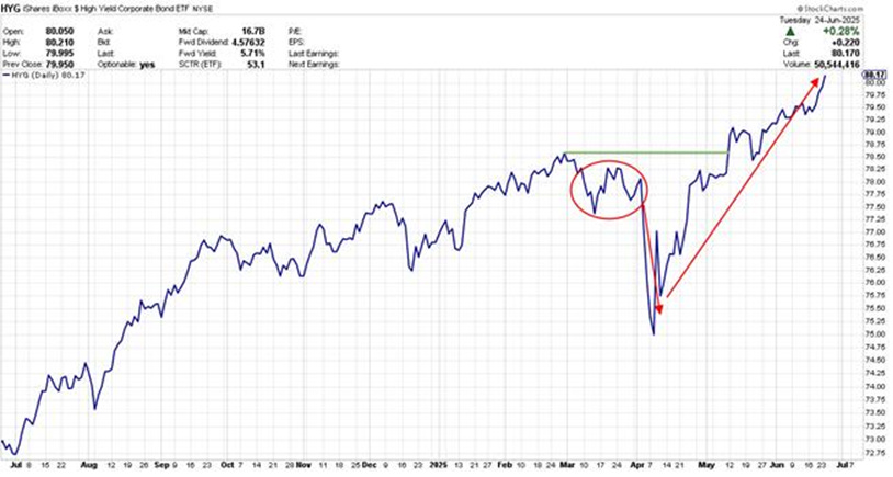 Our red down arrow in the first week of April noted their chiming in with increased recession concerns. This while other markets were putting on massive downside with extreme volatility. Again, the relative outperformance of these high-risk corporate bonds kept our attention.