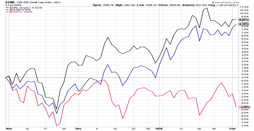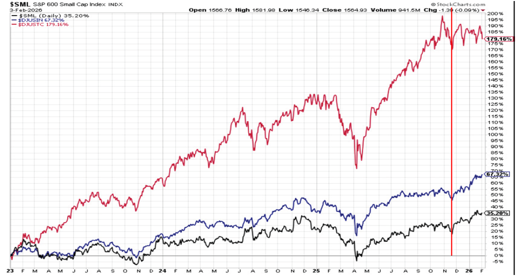 On the broadening front, note the tremendous outperformance of the previously lackluster areas of the industrial space and the small company index shared in our first chart. Since November 1st, they have been trouncing the technology space in behavior and performance.