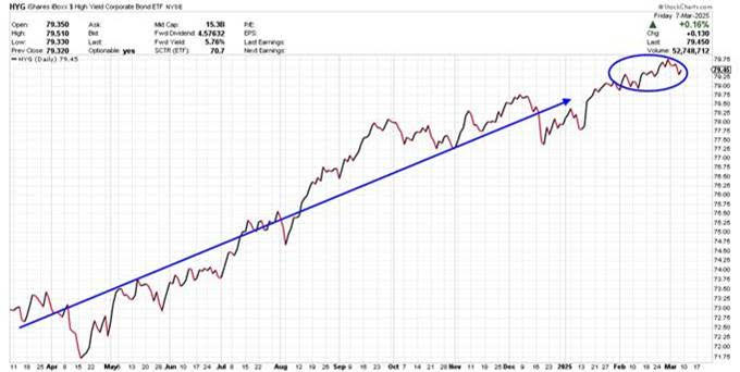 Above is a one-year chart of a high-yield corporate bond vehicle on a price basis. Our blue upward-trending arrow highlights the solid trend over the previous year.